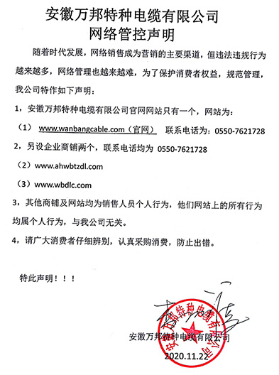 鄭重聲明:安徽萬邦特種電纜有限公司官方網站為:www_wanbangcable_com.sdtwwh.cn,除此之外無任何子網站或合作網站,其余均為假冒偽劣。電話:0550-7621728 13485756353 地 址:安徽省天長市滁州高新技術產業開發區經四路29號